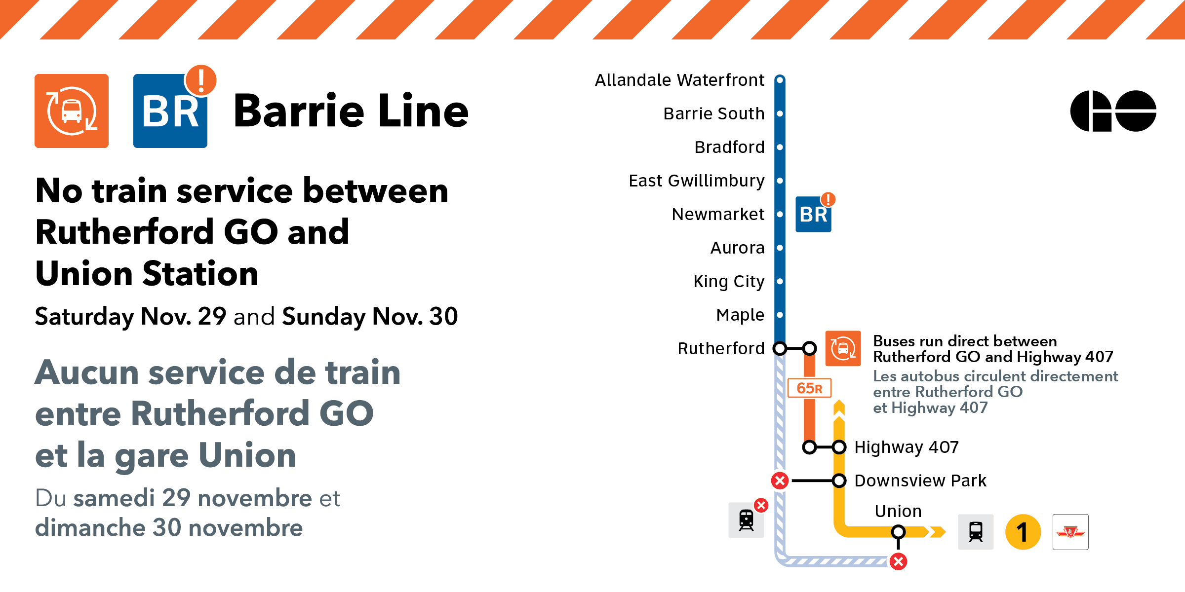 - Les trains continueront d’arriver et de partir de la gare GO d’Allandale Waterfront et de Rutherford selon l’horaire prévu.