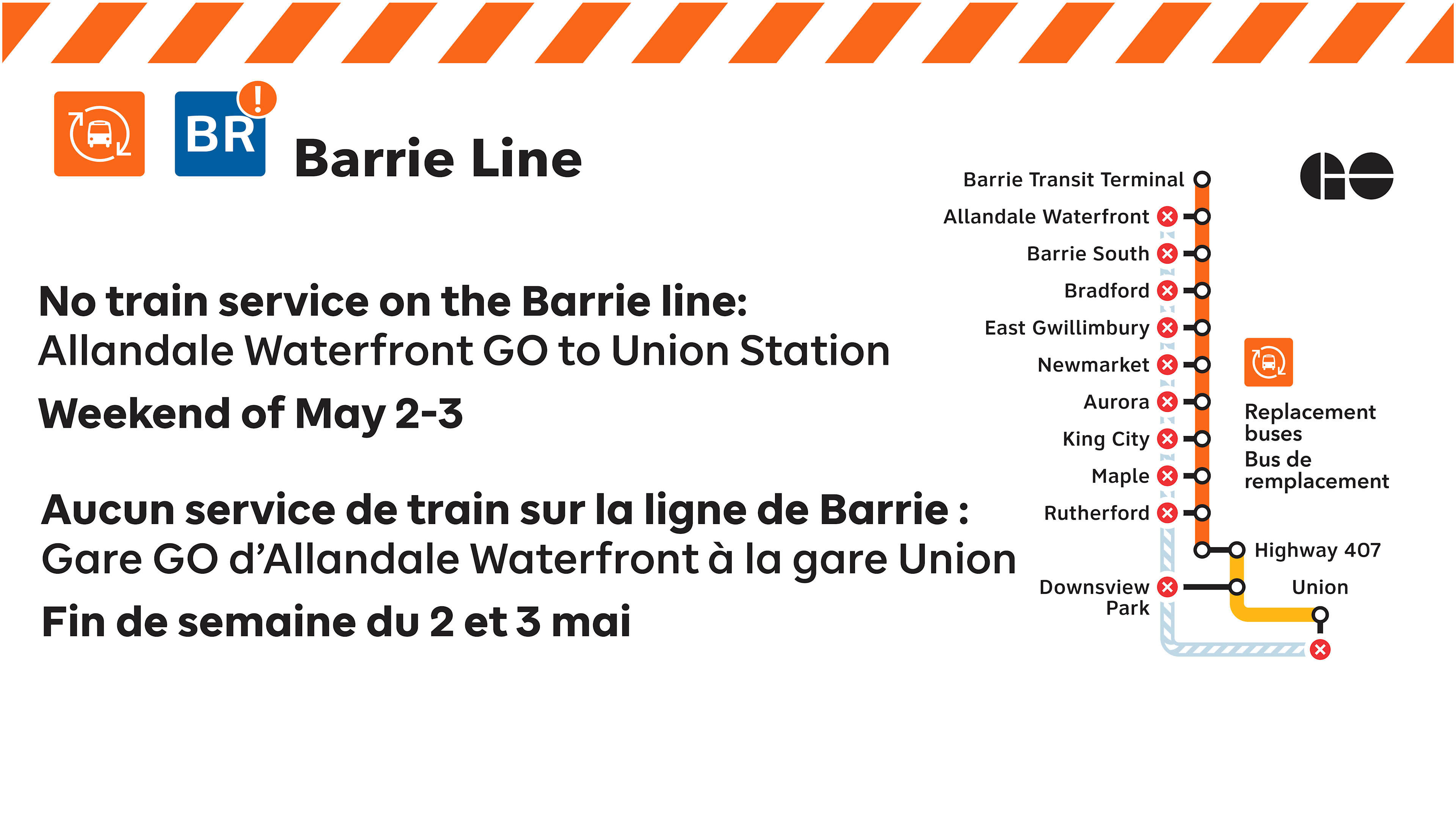Les 2 et 3 mai, les autobus GO remplaceront les trains partout, sauf aux gares GO Downsview Park et Union. Les autobus GO circuleront entre la gare GO Allandale Waterfront et la station d’autobus de l’autoroute 407.