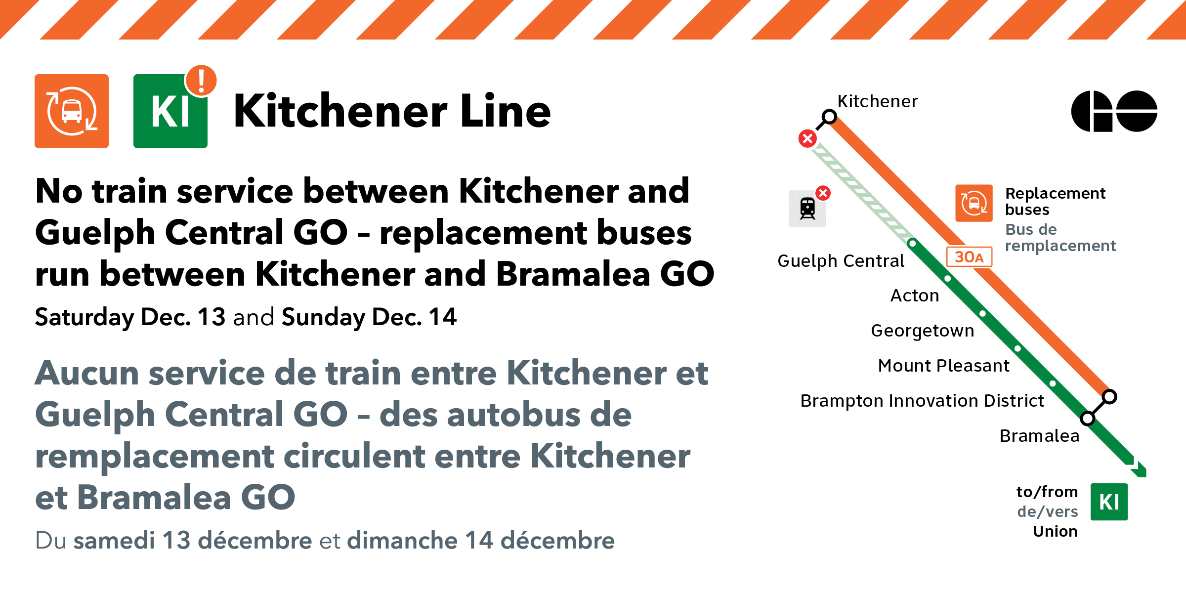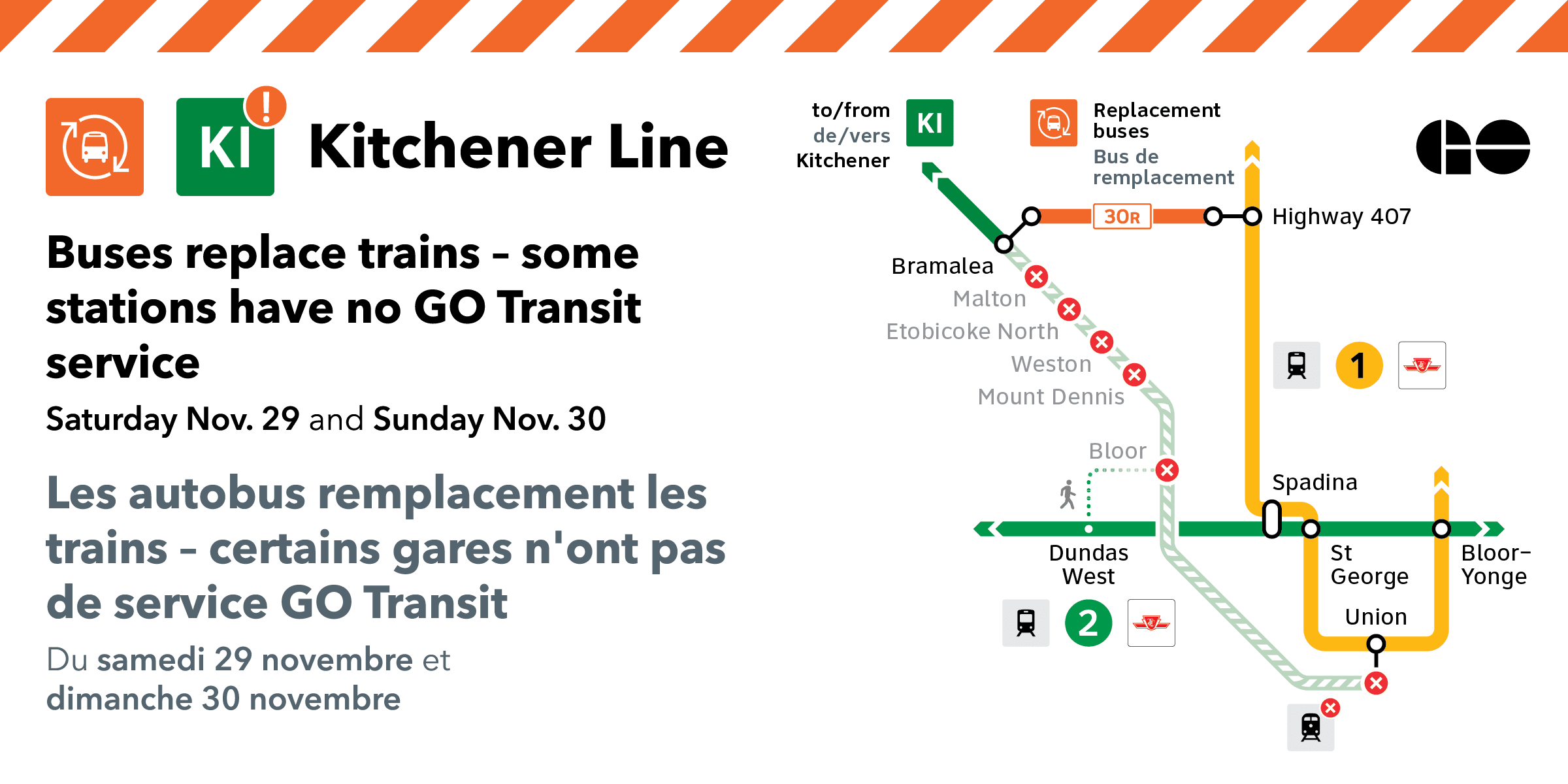 Le samedi 29 et le dimanche 30 novembre, des autobus GO remplaceront le service ferroviaire direct reliant la gare GO de Bramalea à la gare routière de l’autoroute 407. Les trains circuleront toutes les regular entre les gares GO de Bramalea et Kitchener en raison de travaux de construction.