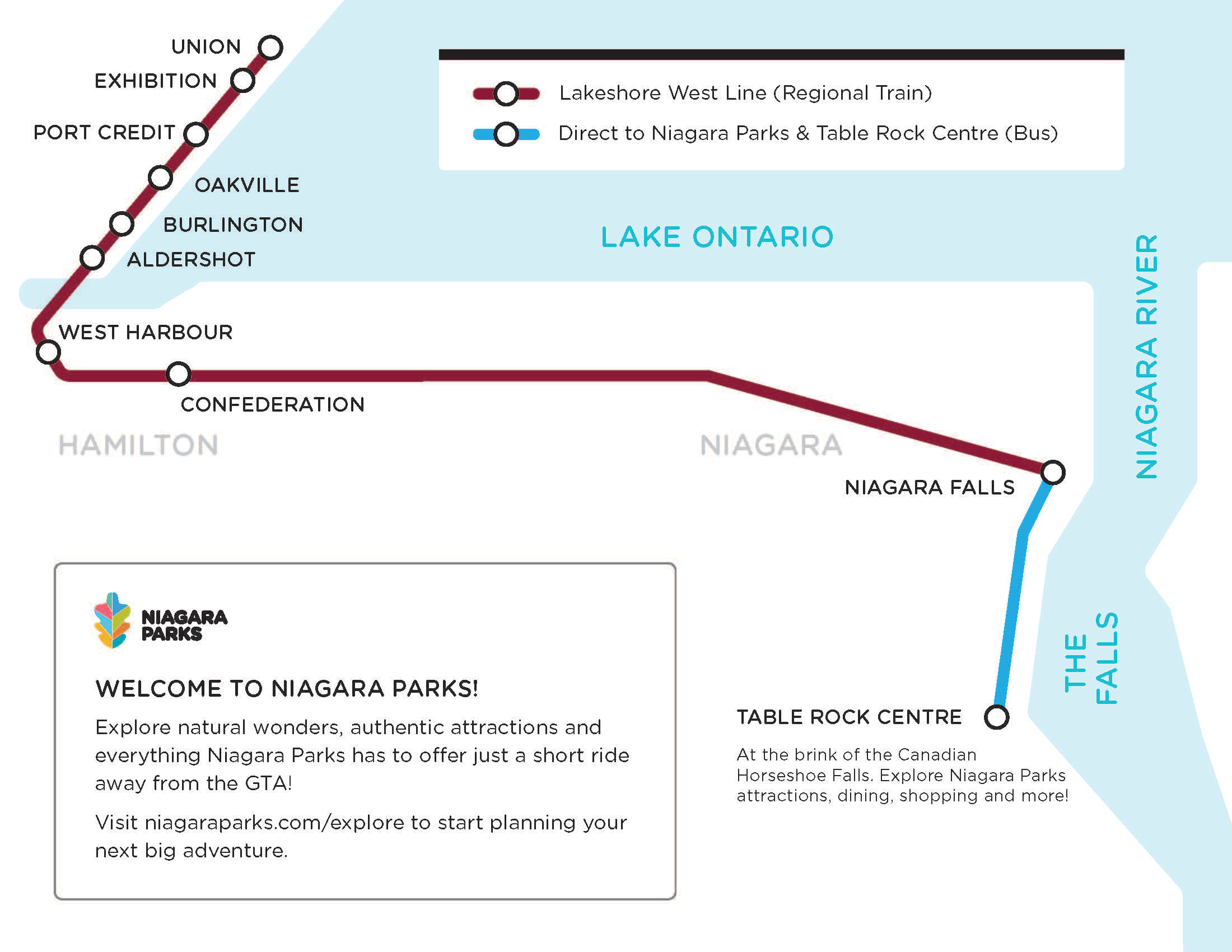 - Tous les trajets existants de Lakeshore West desservant Niagara Falls en semaine et le week-end s’arrêteront désormais à la gare GO Confederation.